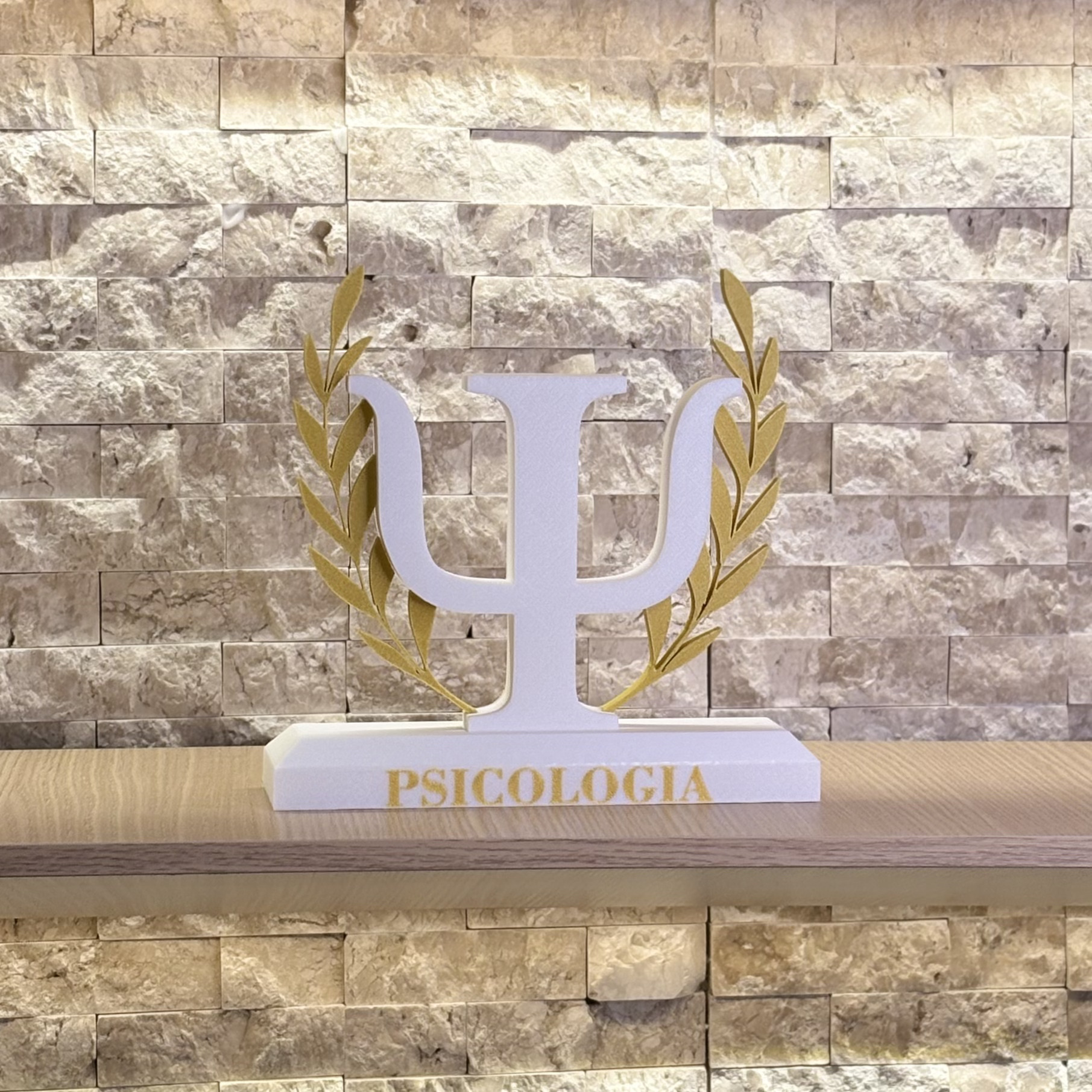 Com acabamento refinado em branco e detalhes dourados, ele apresenta o símbolo da Psicologia acompanhado de ramos de louros, que representam vitória, conquista e reconhecimento.